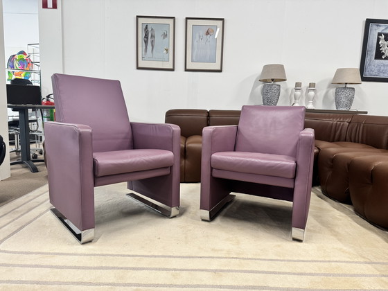 Fauteuil Jori Navy en cuir Lipano de couleur lilas. Un fauteuil élégant avec une assise super confortable car le fauteuil repose sur des pieds traîneau à ressorts et par une simple poussée vous pouvez générer un dossier haut pour un confort d'assise supplémentaire. En bref, un fauteuil haut hauteur d'assise 44 cm. Nouveau prix par pièce €3850. Cette paire de fauteuils Jori présente un design moderne et élégant avec un revêtement en cuir violet. Les fauteuils sont soutenus par de solides pieds en métal, ajoutant une touche d'élégance et de durabilité. Parfaits pour un espace de vie contemporain, ces fauteuils offrent à la fois confort et style.