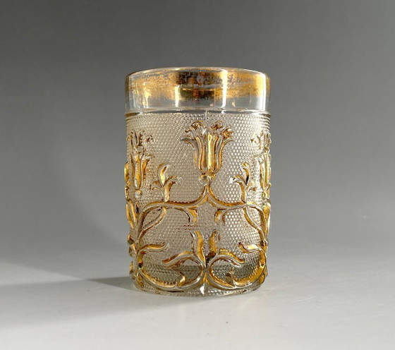 Il s’agit du modèle n° 1183, référencé dans le catalogue Rindskopf n° 12A. Datant de la période 1920-1927, il illustre avec élégance la transition entre l’Art nouveau tardif et l’Art déco. Le décor présente un fin relief de tulipes stylisées sur une surface texturée en verre dépoli, rehaussée d’une dorure partielle.