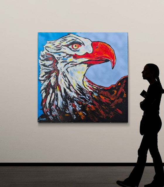 Grande œuvre unique de 80x80x3,5 cm, issue d'une série de peintures dans le style Street / Pop art, de l'artiste professionnel / contemporain néerlandais Jovan Srijemac (1962). L'œuvre est peinte sur toile 3D avec de la peinture acrylique, un couteau à palette et un marqueur acrylique. (Inspiration de l'aigle d'Andy Warhool). L'œuvre est signée à la main, accompagnée d'un certificat d'authenticité, vernie et prête à être accrochée. Les côtés sont peints comme faisant partie de la peinture et ne nécessitent pas d'encadrement. Cette œuvre s'intègre parfaitement dans un intérieur moderne ou un bureau.