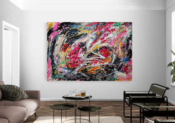 Grande peinture abstraite unique de Jovan dont la taille totale de la toile (avec les bordures blanches supplémentaires) est de 105 x 150 x 01 cm. L'œuvre a été peinte en 2025. La peinture est envoyée roulée, sans cadre musculaire. Une fois montée sur le cadre, la taille de la toile (image) est de 95 x 140 x 2 cm : 95 x 140 x 2 cm. Pour votre information : original Galerie/Atelier prix 2650 euros Dans cette œuvre, j'ai libéré mes émotions les plus profondes, permettant aux couleurs audacieuses et aux touches de couleurs puissantes de s'entrecroiser dans une danse dynamique. Le chaos crée un sentiment d'harmonie, symbolisant la tension vibrante entre le terrestre et le divin. Cette peinture procure un sentiment de bien-être et de détente. L'œuvre est peinte à l'acrylique sur une toile XXL. La peinture est appliquée de manière expressive et très dynamique sur la toile. L'œuvre est vernie et accompagnée d'un certificat d'authenticité. La dynamique, l'expression et la liberté de l'expression artistique de l'artiste sont clairement visibles. Original , très unique œuvre expressionniste abstraite par l'artiste professionnel /contemporain néerlandais (depuis le début des années 1980) Jovan Srijemac (1962) ... Cette œuvre s'intègre bien dans un intérieur moderne ou un espace de bureau . Le chaos des idées créées dans ma tête, l'énergie intérieure volée, veut que, comme un volcan, sorte et devienne une explosion et une symphonie de couleurs sur la toile, encadrée avec de la matière, des figures, des visages ou une composition abstraite. De l'application inconsciente, souvent chaotique et explosive de la peinture sur la toile, émergent : des figures, des objets, des portraits ou une composition abstraite initialement non planifiés. Comme dans la conception non planifiée d'un enfant : la naissance, la croissance, la formation de la personnalité et sa vie. Souvent conçus à l'improviste, nous naissons, grandissons, et nous sommes tous encadrés dans le corps, notre cadre, mais chacun est unique à sa manière. ''