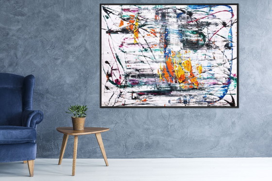 Le tableau mesure 115 x 150 cm et dispose de l'espace nécessaire sur chaque bord pour être tendu sur un châssis de 100 x 140 cm. Profondeur de châssis adaptée : 2 à 5 cm.