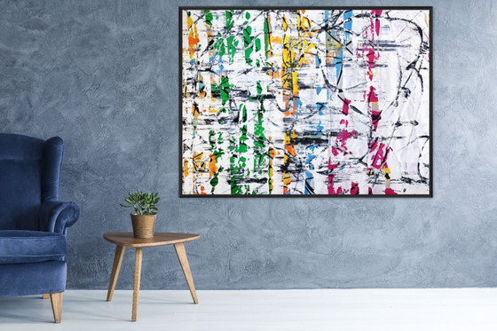 Le tableau mesure 115 x 150 cm et dispose de l'espace nécessaire sur chaque bord pour être tendu sur un châssis de 100 x 140 cm. Profondeur de châssis adaptée : 2 à 5 cm.