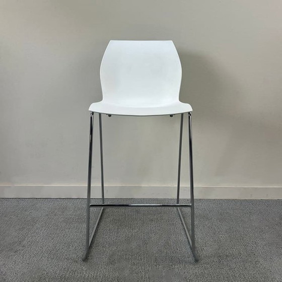 Chaise Kalea de Kastel avec dossier vert et piètement luge chromé. Légèrement plus haute, empilable et confortable. Pratique et résistante, idéale pour les cantines, les salles de réunion ou les tables hautes.
