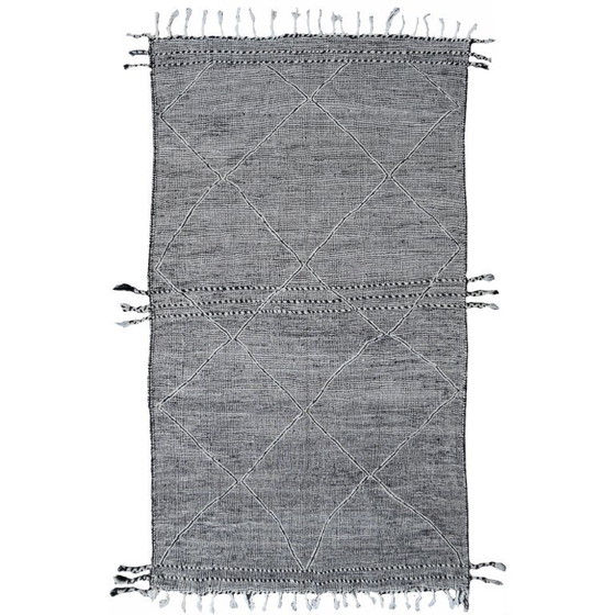 Ce tapis kilim berbère tissé à la main au Maroc apporte une touche d'exotisme et de tradition à votre intérieur. Avec ses motifs classiques noirs et blancs, il s'intègre parfaitement à tout décor, moderne ou traditionnel.
