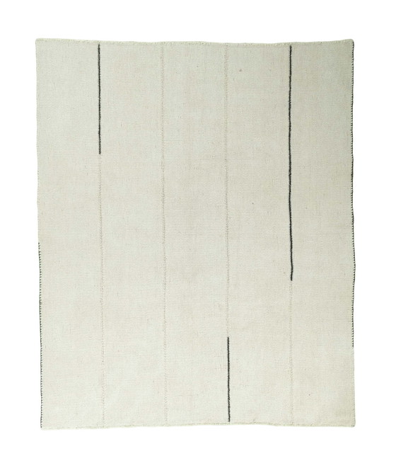 Ce kilim design minimaliste Fars allie l'artisanat traditionnel et le design moderne. Sa surface sobre de couleur crème est interrompue par des lignes discrètes et fines qui lui confèrent une esthétique élégante et intemporelle. Avec ses dimensions de 300 x 254 cm, ce kilim est parfait pour les intérieurs modernes.