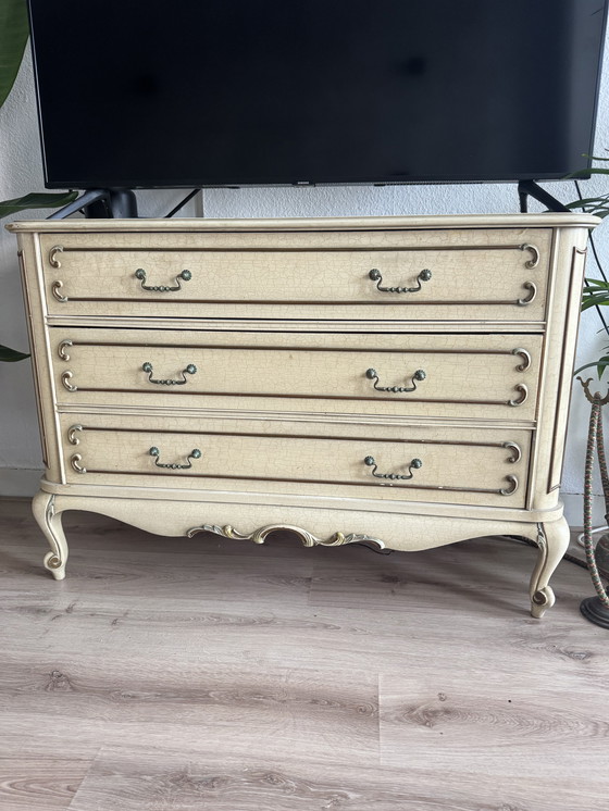 Apportez une touche d'élégance à votre intérieur avec cette charmante commode vintage de style Louis XV. Ses courbes gracieuses et ses poignées ouvragées lui confèrent un charme classique, idéal pour les amateurs de design intemporel.