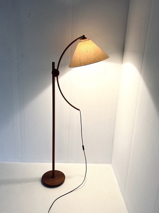 Lampadaire vintage modèle 'Arcea' conçu par la marque allemande de qualité Domus, années 1970. Base ronde en teck lestée, tige en teck massif et luminaire en teck magnifiquement incurvé équipé d'un abat-jour en tissu. Un design magnifique. La lampe est facilement réglable en hauteur et en profondeur à l'aide d'un bouton rotatif situé sur l'articulation. La lumière se diffuse magnifiquement à travers l'abat-jour de forme primitive. La lampe est équipée d'un interrupteur sur le cordon et d'un raccord E27 normal. En très bon état. Taille Hauteur maximale 160 cm Profondeur 85 cm Diamètre de l'abat-jour 40 cm