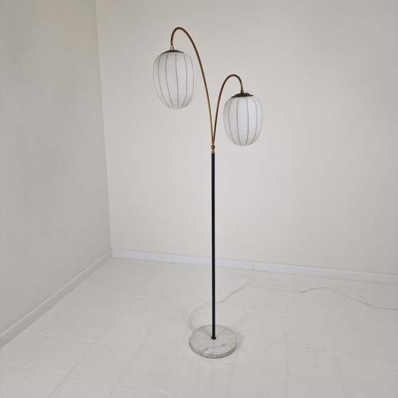 Absolument magnifique et très rare lampadaire italien, fabriqué au début des années 60. Il est composé d'un pied en acier laqué noir et d'une base ronde en marbre. Les deux bras en laiton soutiennent les abat-jours ovales en verre opalin. Il pourrait s'agir d'une lampe Stilnovo, mais elle n'est pas marquée. Spécifications de l'ampoule : E-27 Ampoule. Quelques traces normales d'utilisation, voir les photos. La lampe a été recâblée par un professionnel.