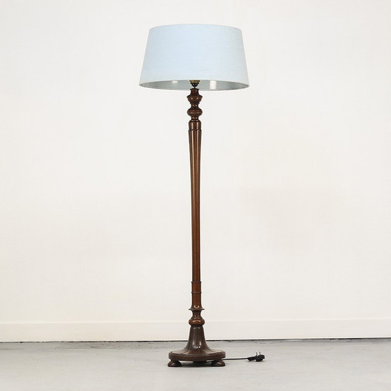 Magnifique lampadaire en noyer fabriqué par Pander. La lampe date des années 1940/1950 et est équipée d'un nouveau fil, d'une nouvelle prise et d'une nouvelle fiche. L'abat-jour en tissu est de couleur bleu clair. Hauteur 180 cm, diamètre de l'abat-jour 60 cm.