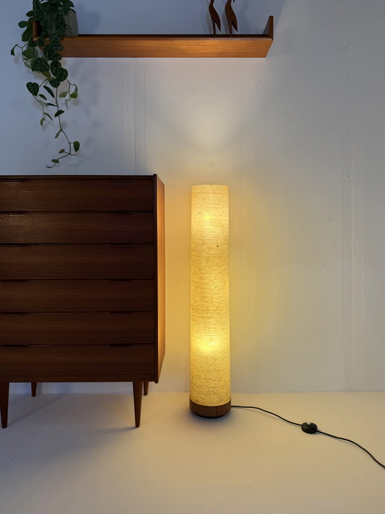Magnifique lampadaire unique. Son socle lesté est orné d'un élégant placage en teck. Il est composé d'un tube cylindrique élancé équipé de trois douilles E27 standard, positionnées à trois hauteurs différentes.