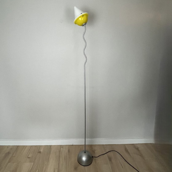 Ce joyeux lampadaire design de la marque italienne La Relco est unique. Son design, qui rappelle le style Memphis, est simple mais frappant : un pied élancé avec une sorte de mouvement de vague, une base bulbeuse et un petit abat-jour en verre en deux parties. Le pied est en acier peint en gris et l'abat-jour est une combinaison de verre jaune et blanc. La lampe est encore en bon état et fonctionne à l'aide d'un interrupteur au pied sur lequel sont indiqués la marque (La Relco) et le modèle (Punto A). La lampe mesure environ 190 cm de haut et est équipée d'une douille normale (pas d'halogène).