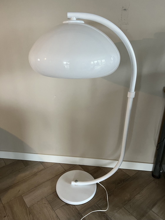 Très rare lampadaire 'serpent' de Dijkstra avec bras flexible 'serpent' et abat-jour en forme de champignon blanc. Le mécanisme de pivotement de la base vous permet de positionner la lampe comme vous le souhaitez, créant ainsi une belle forme de serpent. La lampe nécessite une ampoule E27 et dispose actuellement d'une prise UE (facile à utiliser en dehors de l'UE avec un convertisseur de prise/une autre prise). [État] Excellent état, comme neuf. [Dimensions] ø Abat-jour : 45 cm Hauteur : 150 cm Largeur (réglable) : 163 cm