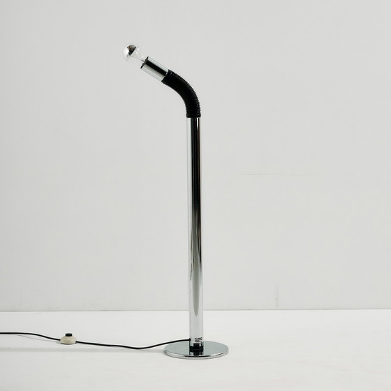 Une véritable pièce italienne de l'ère spatiale. Lampadaire "Elbow" avec base chromée des années 1970, conçu par E. Bellini pour Targetti Sankey. La tige en plastique de la lampe est réglable, ce qui permet d'ajuster l'angle de l'ampoule. Avec des rayures de surface et de l'usure par endroits, mais en bon état vintage.
