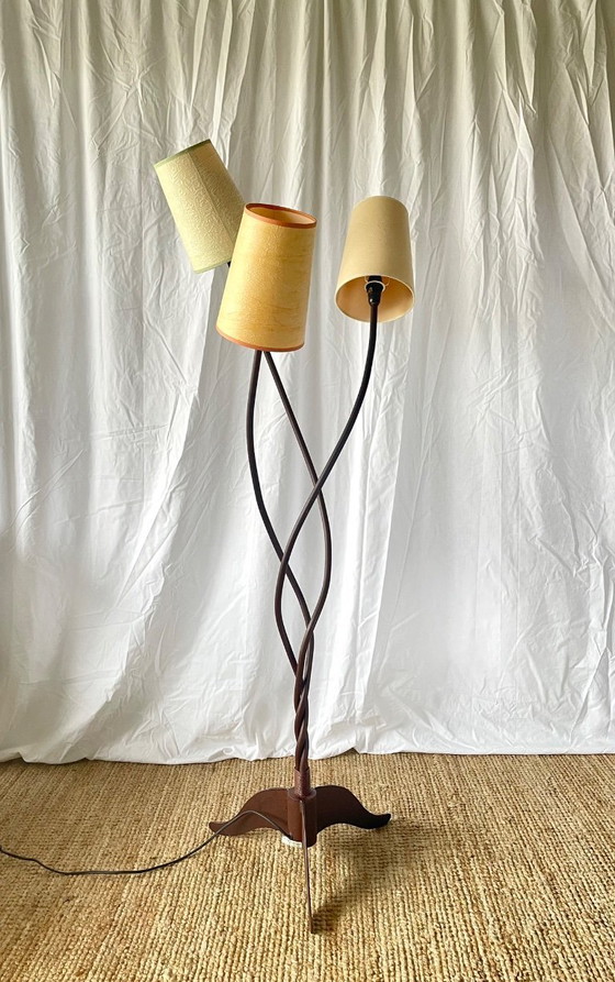 Superbe réalisation en métal brut oxydé et torsadé typique du style de l'artiste. Abat-jours d'origine.