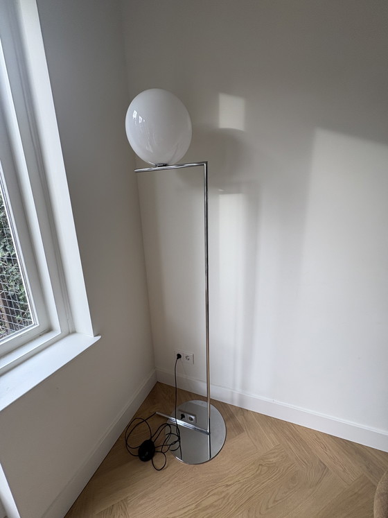 Magnifique lampadaire Flos IC F2, conçu par Michael Anastassiades. Ce lampadaire élégant est doté d'une structure chromée et d'un globe en verre opale qui diffuse une lumière douce et tamisée. Le lampadaire est en bon état, avec seulement quelques rayures sur le socle (voir la troisième photo). Celles-ci sont peu visibles. Le lampadaire est dimmable.