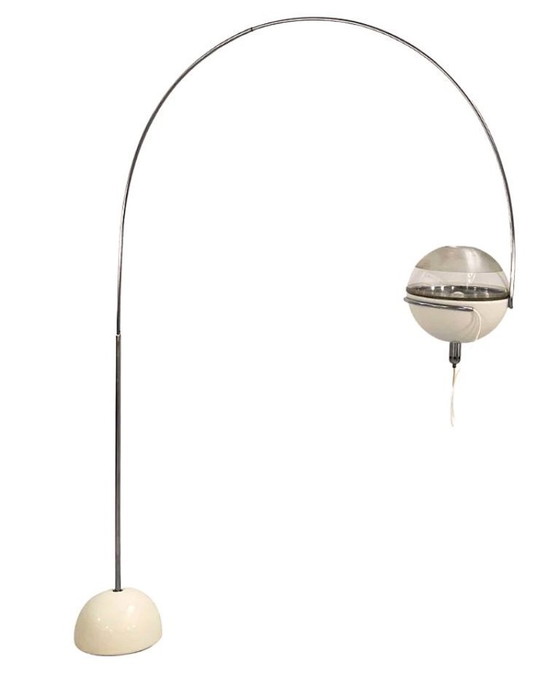 Rare lampadaire « Focus » en forme de globe oculaire, de style futuriste, conçu par Fabio Lenci pour Guzzini. L'abat-jour en verre acrylique, semblable à une lune, diffuse une lumière très chaleureuse et peut être positionné librement dans l'anneau. La base, incroyablement lourde, permet de maintenir l'arc et le poids de l'abat-jour en forme de globe oculaire en place. L'arc peut pivoter à gauche et à droite.