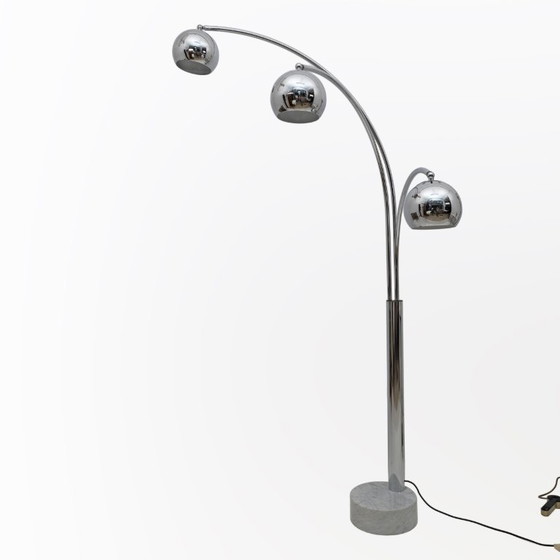 Socle rond en marbre de Carrare. Trois bras arqués avec abat-jour en forme de cloche, orientables de haut en bas et de gauche à droite, et double éclairage.