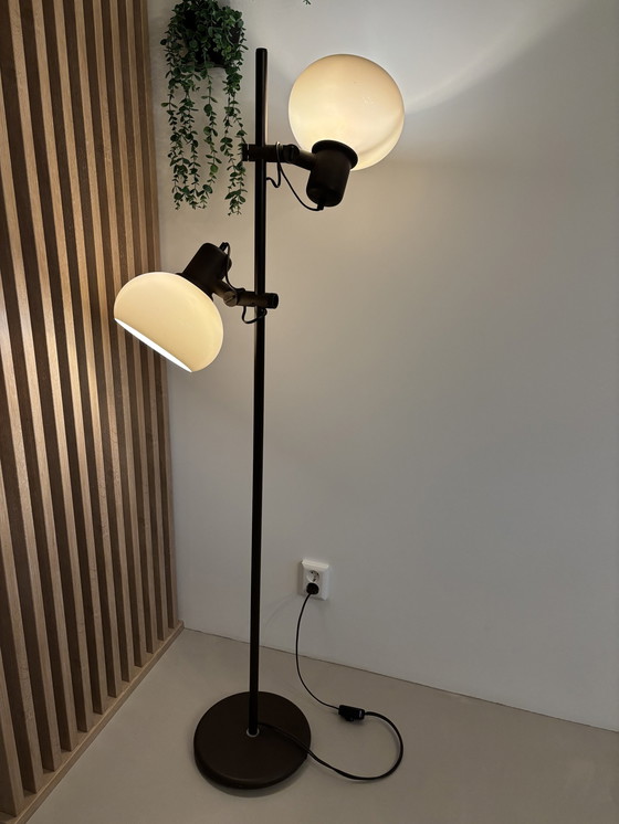 Lampadaire Herda années 1970 - design rétro avec deux abat-jour boule marron fumée. Caractéristiques : ✅ Marque : Herda ✅ Design des années 1970 - Style rétro de l'âge de l'espace ✅ Deux sphères réglables - Acrylique marron ✅ Matériau : Métal et plastique ✅ Hauteur : 160 cm ✅ Fonctionne et en bon état Condition et détails : ✔️ La lampe est entièrement fonctionnelle, les deux ampoules fournissent une lumière d'ambiance et peuvent être allumées et éteintes séparément par l'interrupteur au pied. ✔️ Quelques légères traces d'utilisation correspondant à son âge, quelques rayures sur les abat-jours (voir dernière photo de détail) mais pas de déformation ou de fissure dans l'abat-jour ! ✔️ Parfait pour un intérieur vintage ou industriel !