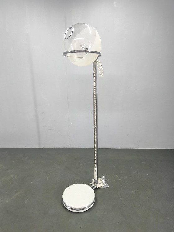 Lampadaire italien chromé à globe en verre, style Lenci, années 1970