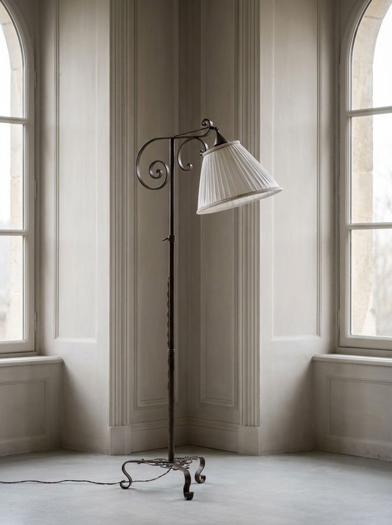 Magnifique lampadaire en fer forgé aux élégantes volutes et à l'abat-jour plissé original en tissu. Réglable en hauteur, il diffuse une lumière chaude et tamisée. Idéal pour un intérieur rustique, classique ou vintage. Robuste et en bon état, il est fourni avec sa prise d'origine.