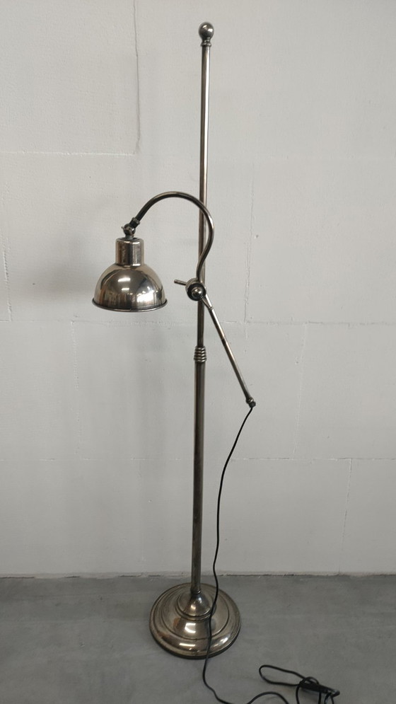 Magnifique lampadaire rétro à l'aspect argenté antique. Robuste et léger, ce lampadaire est doté de parties réglables et pivotantes. Sa patine est du plus bel effet ; les marques d'usure, à la fois voulues et dues à l'usage, lui confèrent un charme particulier. Issu de notre collection privée, il mérite une place de choix sous les projecteurs. Hauteur réglable jusqu'à 176 cm, diamètre de la base : 25 cm, abat-jour : 15 cm de haut et 16 cm de diamètre. Largeur du crochet : 52 cm. Livraison sur rendez-vous uniquement ; nous n'effectuons pas d'expédition. Les dimensions sont approximatives.