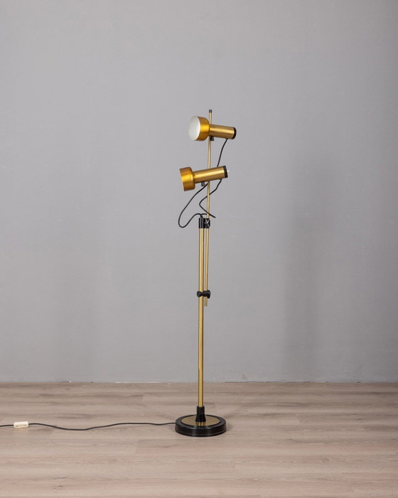 Lampadaire en laiton doré et inserts en plastique noir, avec deux lumières réglables, design italien, années 1970.