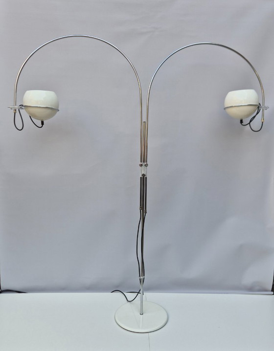 Lampadaire à double arc de la marque néerlandaise Gepo, datant des années 1970. Ce lampadaire est en très bon état, avec de légères traces d'usure. Les ampoules sont fixées librement dans l'anneau, permettant d'orienter la lumière dans toutes les directions. Le long câble est équipé d'un interrupteur au pied permettant d'allumer les lampes individuellement ou simultanément.