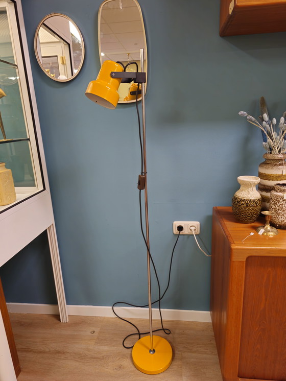 Apportez une touche de charme rétro à votre intérieur avec ce remarquable lampadaire vintage des années 1970. La couleur jaune vif et l'abat-jour réglable en font une pièce fonctionnelle et élégante qui s'intègre parfaitement dans tout espace moderne ou éclectique. La lampe a une base en métal remplie de ciment.
