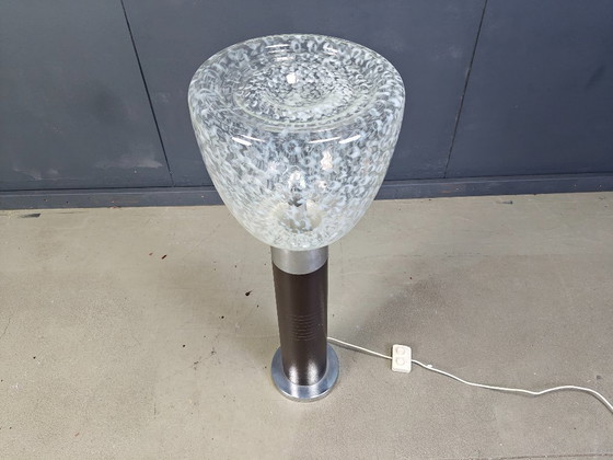 Lampadaire vintage par Mazzega avec une base en métal chromé et brun avec une lampe intégrée dans la base et un abat-jour en verre murano.