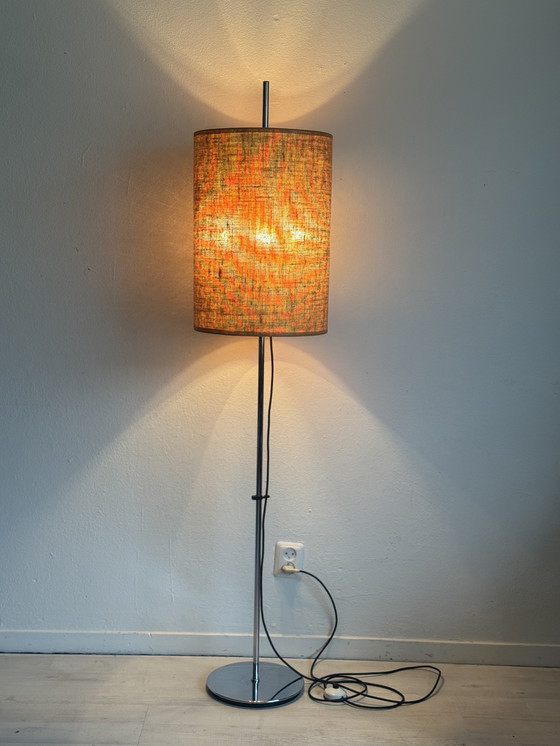 Magnifique lampadaire vintage Staff Leuchten, fabriqué en Allemagne dans les années 60/70. Il est doté d'une base et d'un pied en métal chromé poli, ainsi que de son abat-jour d'origine en jute tressé. Réglable en hauteur le long du pied, il est idéal comme lampe de lecture.