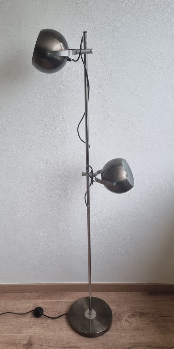 Lampe globe de l'ère spatiale en bon état. Les ampoules sont légèrement plus foncées que le reste de la lampe et contrastent donc agréablement. Les ampoules sont réglables en hauteur et peuvent être tournées dans toutes les directions. L'interrupteur au pied permet d'allumer les points lumineux séparément ou simultanément. La lampe a une hauteur de 162 cm. Le diamètre de la base est de 27 cm. De petites traces d'utilisation (rayures) sont visibles sur les ampoules, voir les dernières photos. Les raccords sont de type E27. N'hésitez pas à envoyer un message avec des questions ou pour plus de photos.
