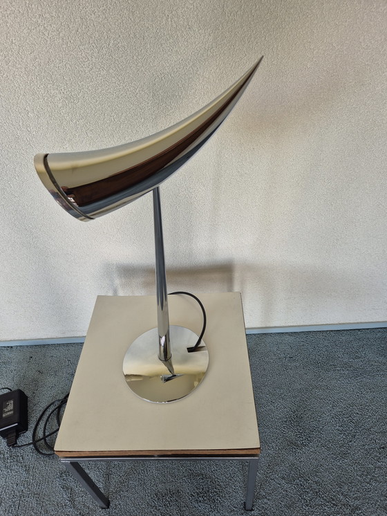 Lampe de table Ara par Philip Starck. Pour le fabricant Floss. L'œil en verre situé à l'avant de la lampe se détache parfois de son support. Le ressort qui le maintient en place doit être ajusté.