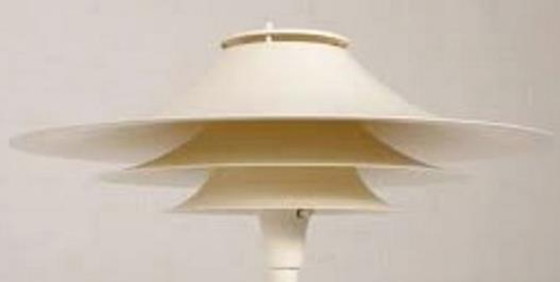 Magnifique lampe. Type Ardina par Lyfa Danemark. E095. Belle lampe au look chaleureux. Se marie bien avec tous les styles d'ameublement. Particulièrement avec le style scandinave, une combinaison parfaite. Mid Century. La lumière est filtrée à travers les lamelles pour une lumière indirecte très atmosphérique. Couleur : blanc cassé. Elle contient une ampoule à économie d'énergie. L'interrupteur/bouton-poussoir se trouve sous l'abat-jour pour une utilisation facile. Pour le passionné/connaisseur de cette lampe. Petite irrégularité dans le bol extérieur, non perceptible si l'on tourne un peu l'abat-jour. Hauteur d'environ 1,30 m et diamètre de la plus grande lamelle d'environ 48-50 cm.
