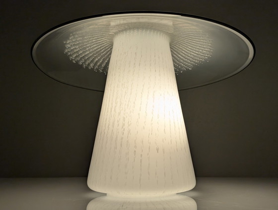 Lampe de table en verre de Murano qui évoque l'élégance de la silhouette en forme de champignon, si caractéristique des plus beaux designs du milieu et de la fin du XXe siècle, avec son motif linéaire blanc exclusif connu sous le nom d'effet méduse. Conçue dans les années 1980, cette pièce combine des lignes douces et fluides avec du verre opalin de Murano magistralement travaillé, dont la texture intérieure imite de délicats motifs organiques. La fusion entre la base opaque et la partie supérieure transparente renforce les jeux de lumière, créant un effet atmosphérique qui transforme n'importe quel espace en un lieu élégant et distingué. Cette pièce porte l'étiquette originale d'un petit producteur artisanal de Murano, dont la production limitée en fait une œuvre hautement exclusive de l'artisanat italien du XXe siècle.