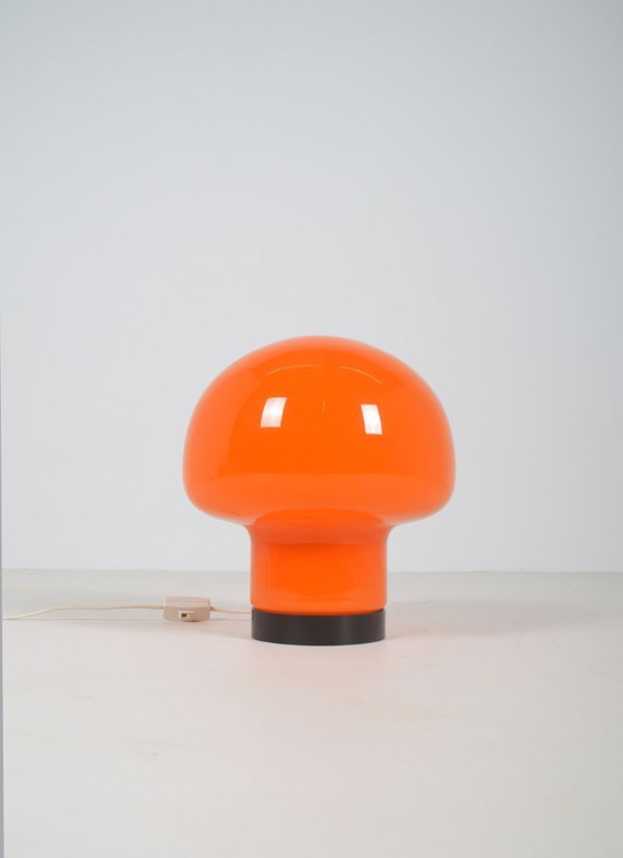 Cette lampe relativement rare est en verre orange avec une couche intérieure en verre opale blanc, diffusant une douce lumière d'ambiance. Le socle métallique sur lequel repose le verre est équipé d'une douille E27.