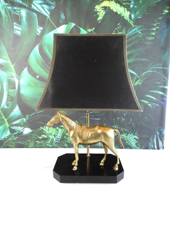 - L'abat-jour noir classique contraste harmonieusement avec les reflets dorés du cheval.