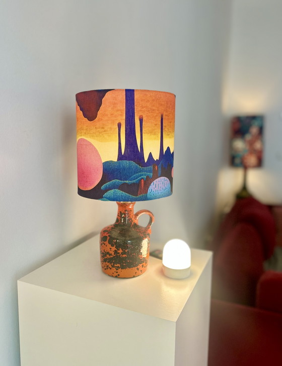 L'abat-jour est recouvert d'un tissu italien haut de gamme en coton 100 % biologique. Le motif représente un paysage planétaire imaginaire orné de stalagmites. La scène évoque un décor de western spatial. Merveilleusement translucide – malgré le tissage serré du tissu –, elle révèle des couleurs intenses, allant d'un orange chaud à un bleu et un vert profonds, avec des contrastes saisissants. Une fois allumée, elle crée une ambiance lumineuse particulièrement envoûtante, jouant sur la profondeur et les dégradés de couleurs – un véritable objet de décoration. Cette lampe attire immanquablement le regard et égaye l'atmosphère.