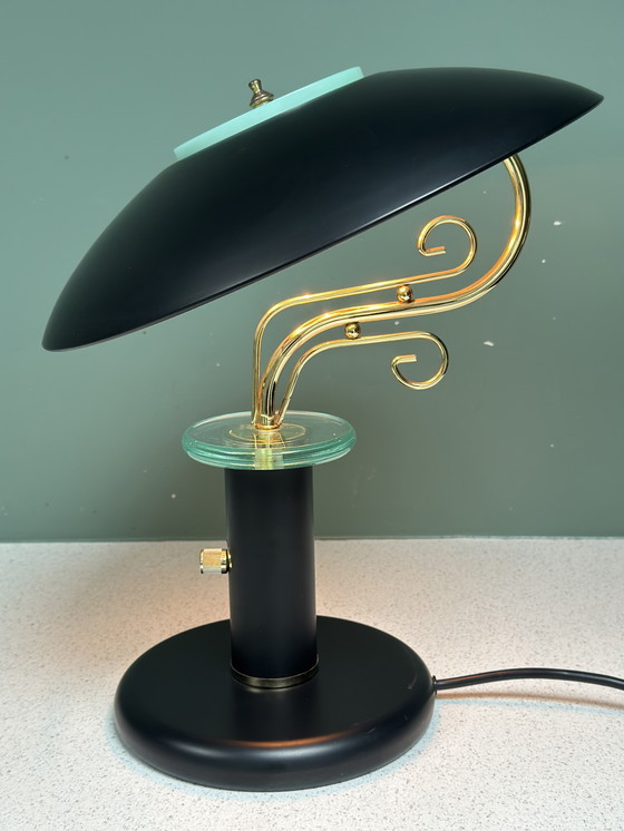 Illuminez votre espace de travail avec la lampe Bankiers vintage des années 1990, une pièce intemporelle qui respire l'élégance et le raffinement. Cette lampe de bureau exquise arbore un superbe coloris noir et or, rehaussé d'une touche unique en verre vert, ce qui en fait un complément idéal pour tout bureau, classique ou contemporain.