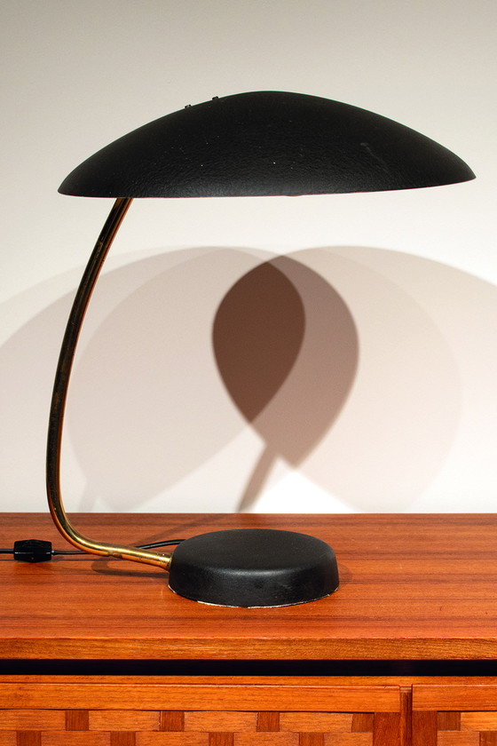 Lampe de bureau Cosack Leuchten avec un grand abat-jour rond texturé et un pied en laiton. Cette lampe, à la forme élégante, serait du plus bel effet sur un bureau de direction, par exemple. L'abat-jour présente quelques ébréchures et le laiton une légère patine. Hormis ces détails, la lampe est en bon état vintage.