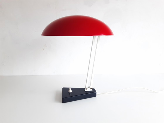 Lampe de bureau vintage classique fabriquée par Hala Zeist. Magnifique lampe de table Midcentury Modern conçue par H.Th.J. Busquet pour la société néerlandaise Hala Zeist. L'abat-jour rouge est relié à la base noire par deux tubes carrés blancs. L'abat-jour et les tubes peuvent être inclinés vers l'avant, ce qui crée un jeu de lignes complètement différent (voir photo 2). L'utilisation claire et simple de différentes couleurs et formes (rond, carré, triangle) rend ce design minimaliste très spécial et intemporel. La version rouge de cette lampe est très rare, la plupart des exemplaires ayant un abat-jour noir ou gris. La lampe est équipée d'une douille E27 et d'un cordon blanc à deux fils avec une prise européenne blanche à deux broches. Dimensions de la lampe : Hauteur : environ 35 cm. Diamètre : 28,5 cm. Base de la lampe : 15 x 10 cm. La lampe présente quelques petits dommages (voir photo 7). Sinon, cette lampe mcm particulière est en bon état vintage.