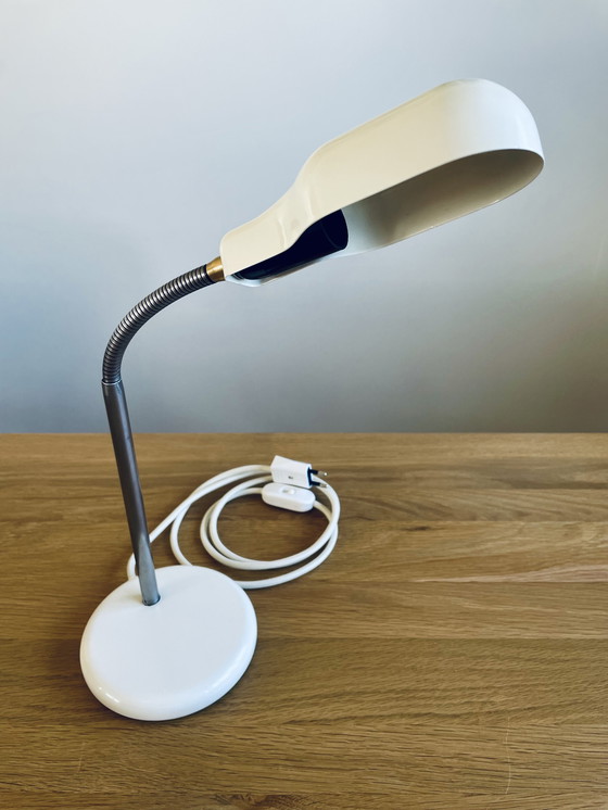 Lampe de bureau vintage en métal blanc pliable, datant des années 1960, de la marque belge Massive. Entièrement rénovée et équipée d'un nouveau câblage, d'un nouvel interrupteur et d'une nouvelle prise. La seule chose qui manque en plus d'un nouvel emplacement est une source de lumière, une petite douille.