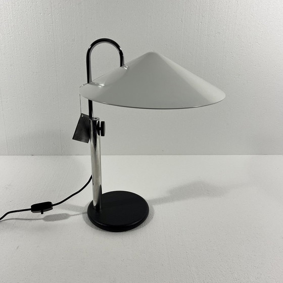 Exceptionnelle lampe de bureau de Kaiser Leuchten, Allemagne (marquée). Base en fonte noire, bras réglable chromé, abat-jour en acier blanc, 1 grand raccord à vis (E27). Cette lampe n'a jamais été vendue et provient d'un ancien inventaire d'un magasin de lampes. 1960's. En très bon état, l'abat-jour a une petite rayure sur le bord. H47/66XL40XP40 cm.