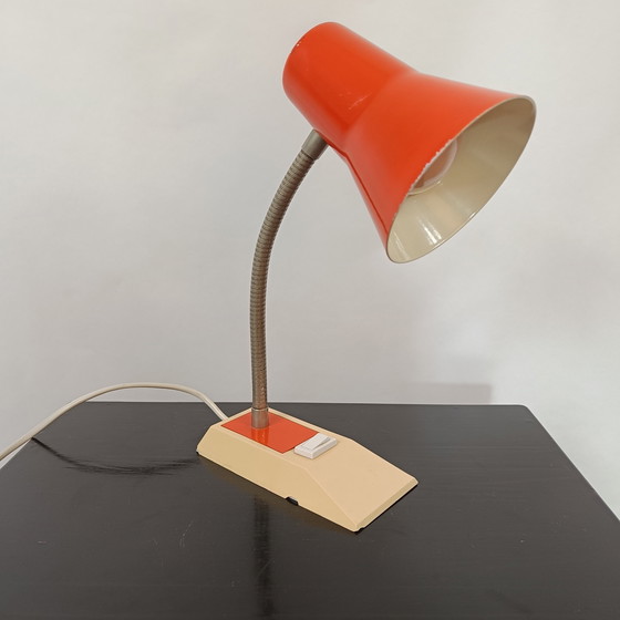 Belle lampe de bureau orange des années 70 avec base en plastique avec interrupteur intégré, pied en métal pliable et abat-jour en métal laqué orange.