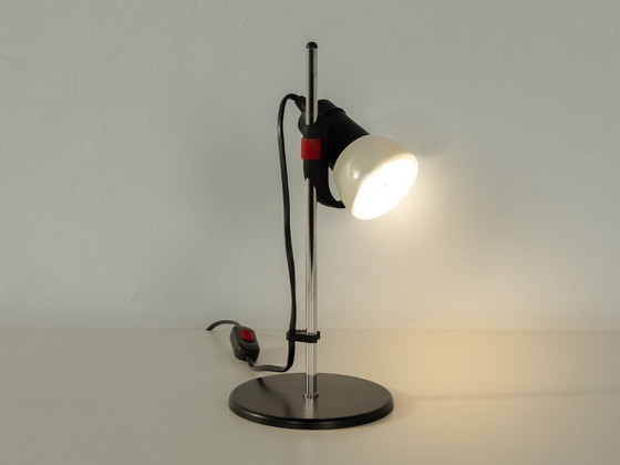 Lampe de bureau classique Seneca des années 1970. Structure en acier inoxydable, abat-jour réglable en hauteur en métal blanc cassé et base en plastique noir. Bon état général, légères traces d'utilisation. Fabriquée en Italie. Fabricant : Seneca (logo sur l'abat-jour).