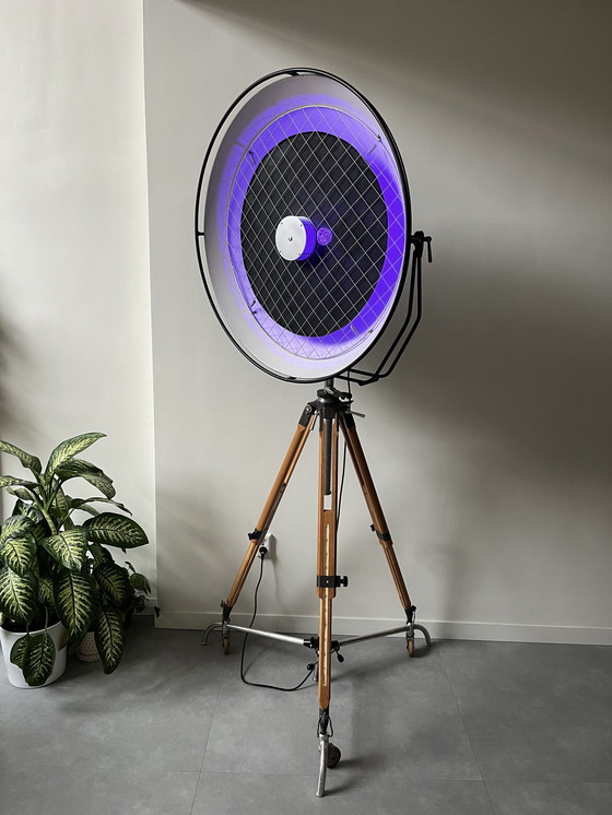 Lampe de studio/cinéma vintage unique, d'un diamètre de plus de 100 cm, montée sur un magnifique trépied Berlebach en bois.