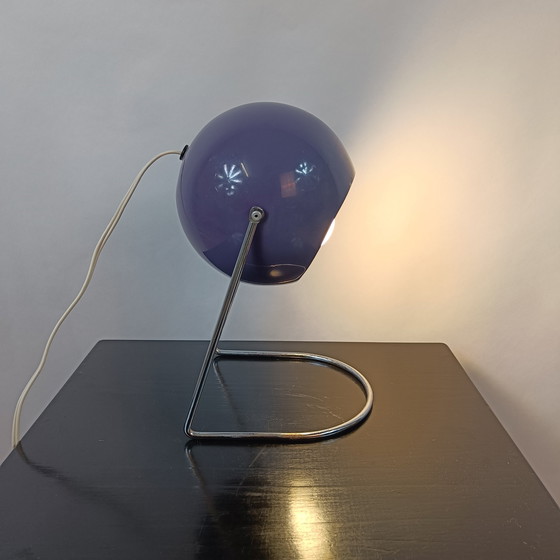 Lampe de table Funky Eyeball d'Anvia datant des années 1970. La lampe a un cadre en métal chromé et un abat-jour boule laqué violet.