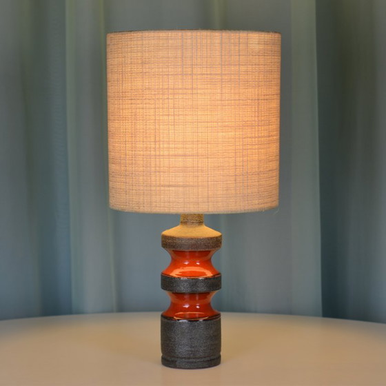 Cette magnifique lampe de table en céramique, typique du milieu du XXe siècle et provenant d'Allemagne de l'Ouest, apporte une touche rétro à n'importe quelle pièce. Avec ses superbes couleurs brun foncé et orange, elle attire tous les regards. Dotée d'un câblage d'origine, elle est compatible avec une ampoule E27. Un véritable coup de cœur pour les amateurs de design vintage.
