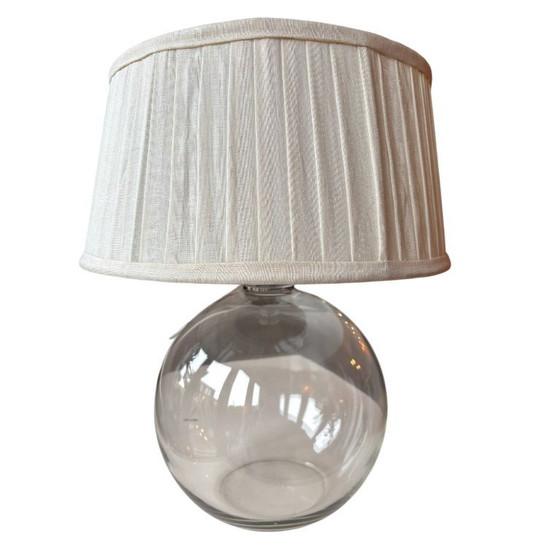 Lampe de table en verre avec une base sphérique et un abat-jour en lin