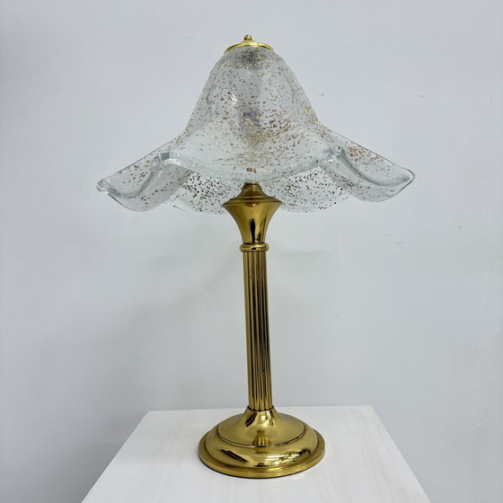 Élégante lampe de table avec abat-jour en verre. L'abat-jour est orné de paillettes dorées. Base en laiton lourd. Dimensions : 76 cm de haut, 46 cm de diamètre : 76cm de hauteur, 46cm de diamètre Condition : Bon laiton avec un peu de patine : 1970 Matériau : Verre, laiton