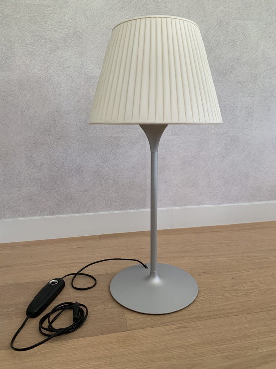 Lampe de table Flos Romeo Soft Table originale, conçue par Philippe Starck. Elle présente un abat-jour plissé en tissu, une tige gris argenté et un socle en aluminium. Elle diffuse une belle lumière chaude et est équipée d'un variateur sur le cordon. *État neuf*. Prix d'achat : 850,00 €.